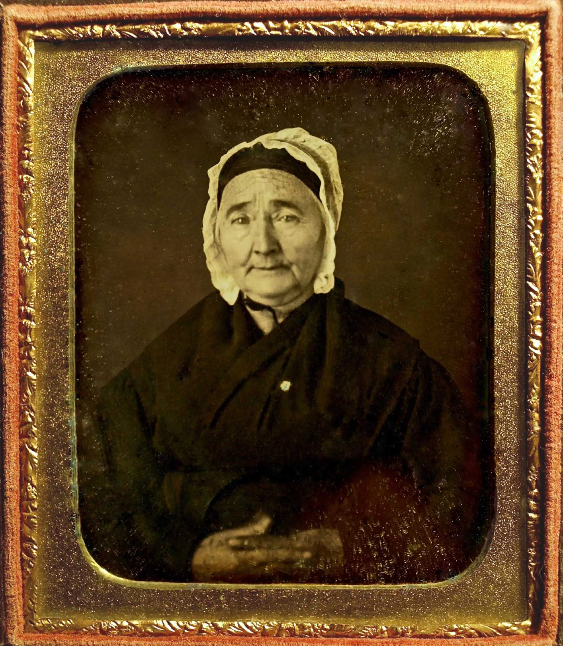 Silvered glass and mercury vapor photographs were among the earliest forms of photography available to the public, and their popularity endured for several decades from 1840 to the late 1850s. Each image produced with this method was unique, as no negative or positive template was created in the process. The mirror-like, silver surfaces were protected by a top layer of glass and usually encased within small, ornamented cases of embossed leather or velvet and presented in gilt brass mats. A rich alternative was black-lacquered cases ornamented with decorative patterns created by mother of pearl inlays.